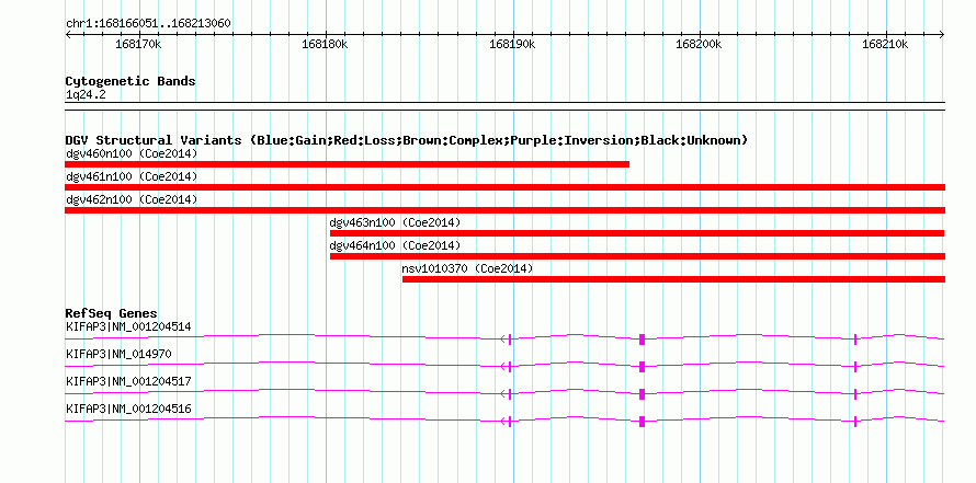 | | Variant Type | CNV loss | | Copy Number | | | Allele State | | | Allele Origin | | | Probe Count | | | Validation Flag | | | Merged Status | M | | Merged Variants | dgv461n100 | | Supporting Variants | nssv3484566, nssv3500796 | | Samples | | | Known Genes | KIFAP3 | | Method | SNP array | | Analysis | Affymetrix SNP array copy number analysis | | Platform | Affymetrix SNP Array 6.0 | | Comments | | | Reference | Coe_et_al_2014 | | Pubmed ID | 25217958 | | Accession Number(s) | nsv1011978