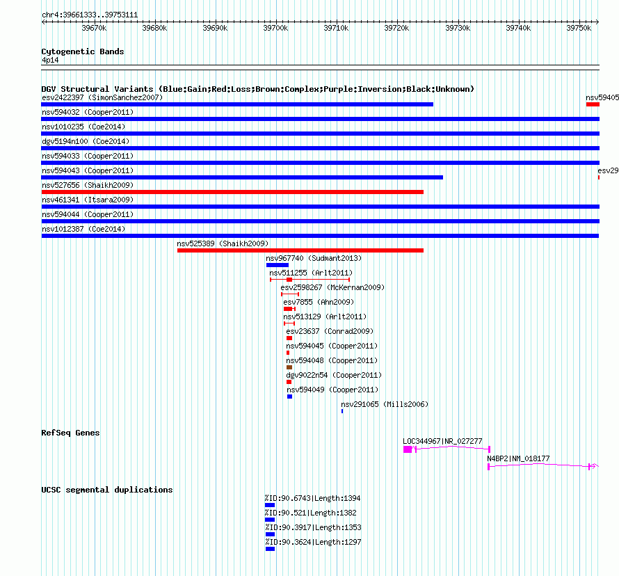 Variant DetailsVariant: nsv1012387| Internal ID | 18754920 | | Landmark | | | Location Information | | | Cytoband | 4p14 | | Allele length | | Assembly | Allele length | | hg38 | 91779 | | hg19 | 91779 | | hg18 | 91779 |