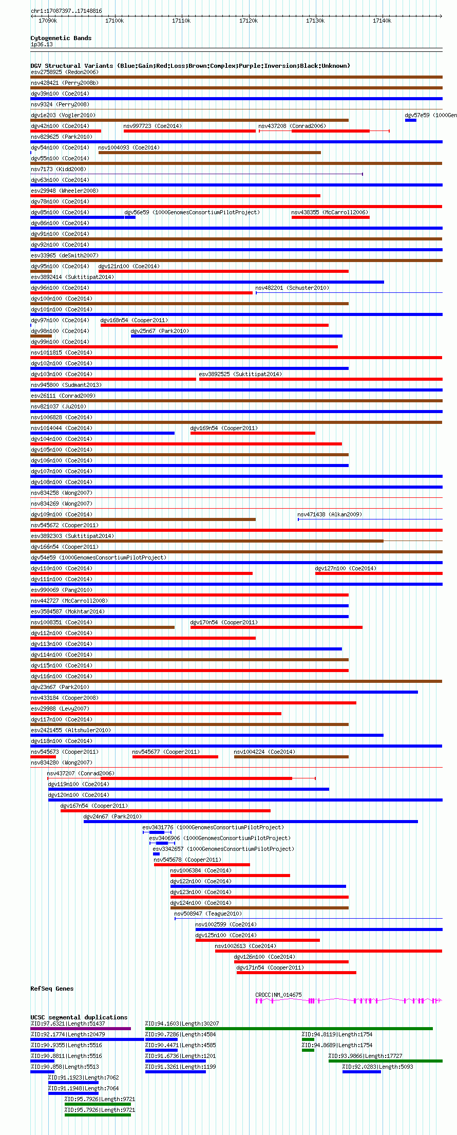 Variant DetailsVariant: nsv1012812| Internal ID | 18755344 | | Landmark | | | Location Information | | | Cytoband | 1p36.13 | | Allele length | | Assembly | Allele length | | hg38 | 61420 | | hg19 | 61420 | | hg18 | 61420 |