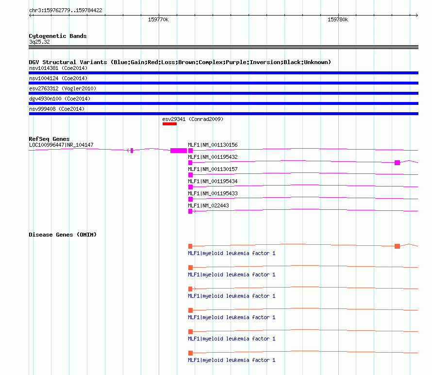 | | Variant Type | CNV gain | | Copy Number | | | Allele State | | | Allele Origin | | | Probe Count | | | Validation Flag | | | Merged Status | M | | Merged Variants | dgv4930n100 | | Supporting Variants | nssv3606394 | | Samples | | | Known Genes | LOC100996447, MLF1 | | Method | SNP array | | Analysis | Affymetrix SNP array copy number analysis | | Platform | Affymetrix SNP Array 6.0 | | Comments | | | Reference | Coe_et_al_2014 | | Pubmed ID | 25217958 | | Accession Number(s) | nsv1013112