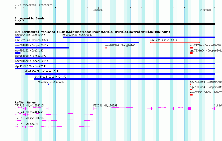 | | Variant Type | CNV gain | | Copy Number | | | Allele State | | | Allele Origin | | | Probe Count | | | Validation Flag | | | Merged Status | M | | Merged Variants | dgv4179n100 | | Supporting Variants | nssv3586856, nssv3586855 | | Samples | | | Known Genes | FBXO36, SLC16A14, TRIP12 | | Method | SNP array | | Analysis | Affymetrix SNP array copy number analysis | | Platform | Affymetrix SNP Array 6.0 | | Comments | | | Reference | Coe_et_al_2014 | | Pubmed ID | 25217958 | | Accession Number(s) | nsv1013220