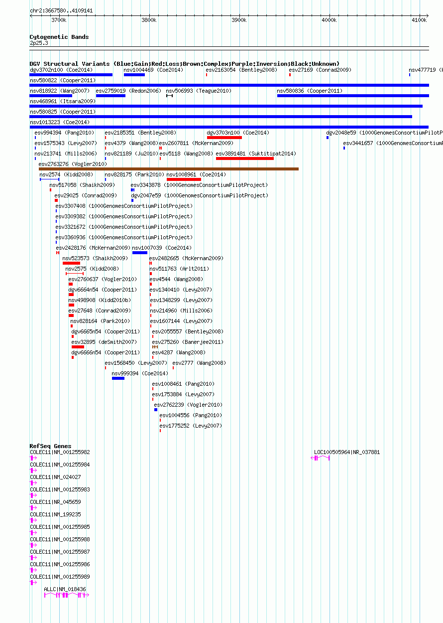 Variant DetailsVariant: nsv1013223| Internal ID | 19102441 | | Landmark | | | Location Information | | | Cytoband | 2p25.3 | | Allele length | | Assembly | Allele length | | hg38 | 441561 | | hg19 | 441562 | | hg18 | 441562 |