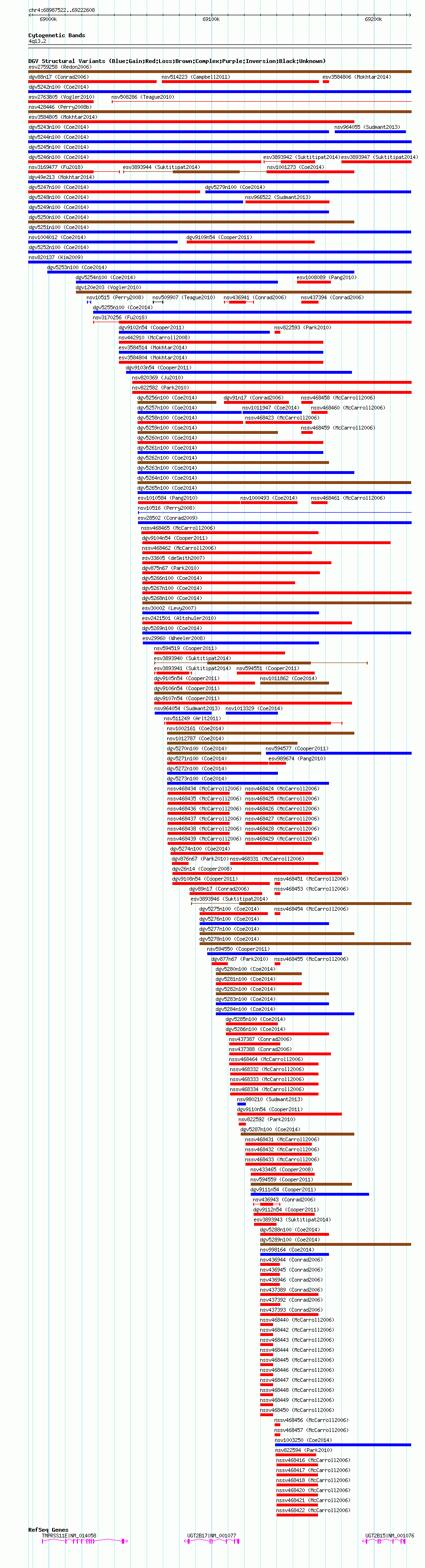 | | Variant Type | CNV gain | | Copy Number | | | Allele State | | | Allele Origin | | | Probe Count | | | Validation Flag | | | Merged Status | M | | Merged Variants | dgv5251n100 | | Supporting Variants | nssv3627048, nssv3627047 | | Samples | | | Known Genes | TMPRSS11E, UGT2B15, UGT2B17 | | Method | SNP array | | Analysis | Affymetrix SNP array copy number analysis | | Platform | Affymetrix SNP Array 6.0 | | Comments | | | Reference | Coe_et_al_2014 | | Pubmed ID | 25217958 | | Accession Number(s) | nsv1013388