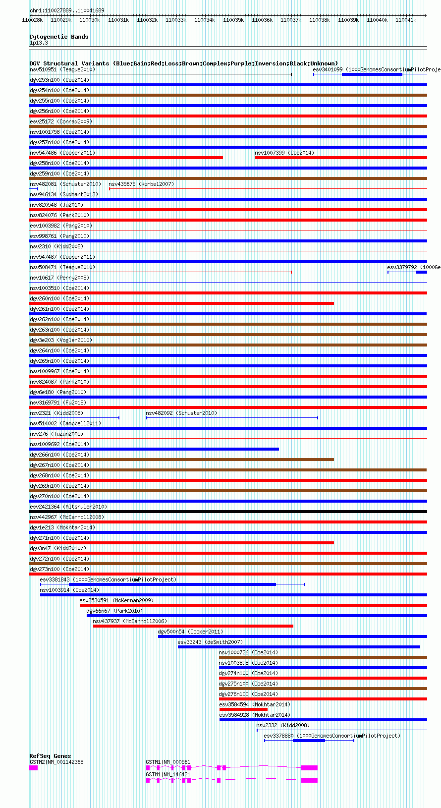 | | Variant Type | CNV gain+loss | | Copy Number | | | Allele State | | | Allele Origin | | | Probe Count | | | Validation Flag | | | Merged Status | M | | Merged Variants | dgv267n100 | | Supporting Variants | nssv3488532, nssv3499717, nssv3497454, nssv3500872, nssv3701888, nssv3493635, nssv3701889, nssv3485217, nssv3496252, nssv3500204, nssv3493863, nssv3493205, nssv3489384, nssv3488573, nssv3492177, nssv3487332, nssv3485815, nssv3497263, nssv3486004 | | Samples | | | Known Genes | GSTM1, GSTM2 | | Method | SNP array | | Analysis | Affymetrix SNP array copy number analysis | | Platform | Affymetrix SNP Array 6.0 | | Comments | | | Reference | Coe_et_al_2014 | | Pubmed ID | 25217958 | | Accession Number(s) | nsv1013492