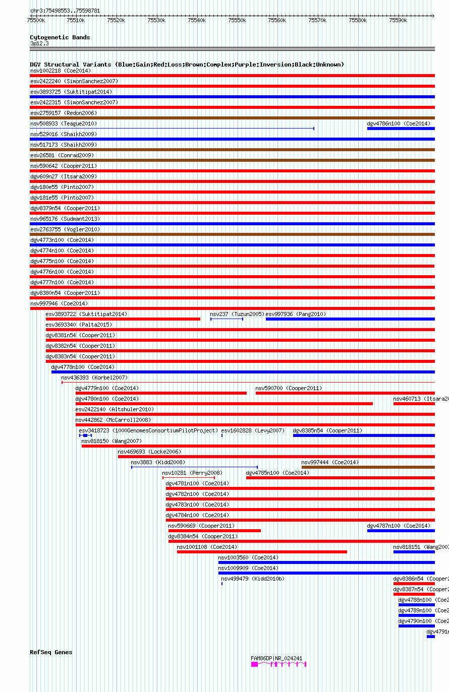 Variant DetailsVariant: nsv1013566| Internal ID | 19102785 | | Landmark | | | Location Information | | | Cytoband | 3p12.3 | | Allele length | | Assembly | Allele length | | hg38 | 100229 | | hg19 | 100229 | | hg18 | 100229 |