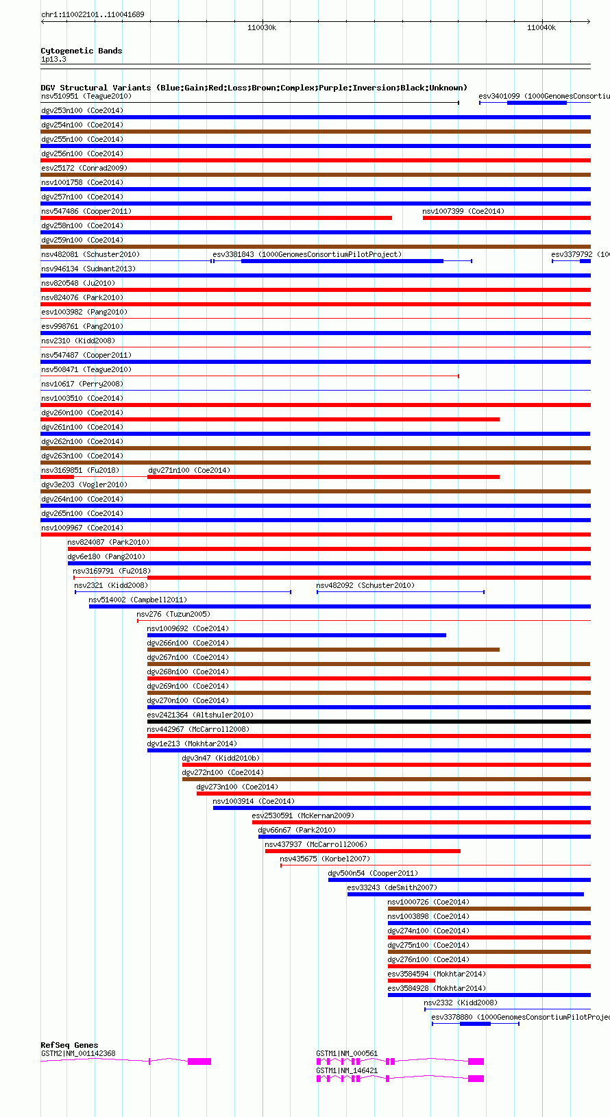 | | Variant Type | CNV gain+loss | | Copy Number | | | Allele State | | | Allele Origin | | | Probe Count | | | Validation Flag | | | Merged Status | M | | Merged Variants | dgv262n100 | | Supporting Variants | nssv3701174, nssv3490085, nssv3701176, nssv3498528, nssv3701175 | | Samples | | | Known Genes | GSTM1, GSTM2 | | Method | SNP array | | Analysis | Affymetrix SNP array copy number analysis | | Platform | Affymetrix SNP Array 6.0 | | Comments | | | Reference | Coe_et_al_2014 | | Pubmed ID | 25217958 | | Accession Number(s) | nsv1013959