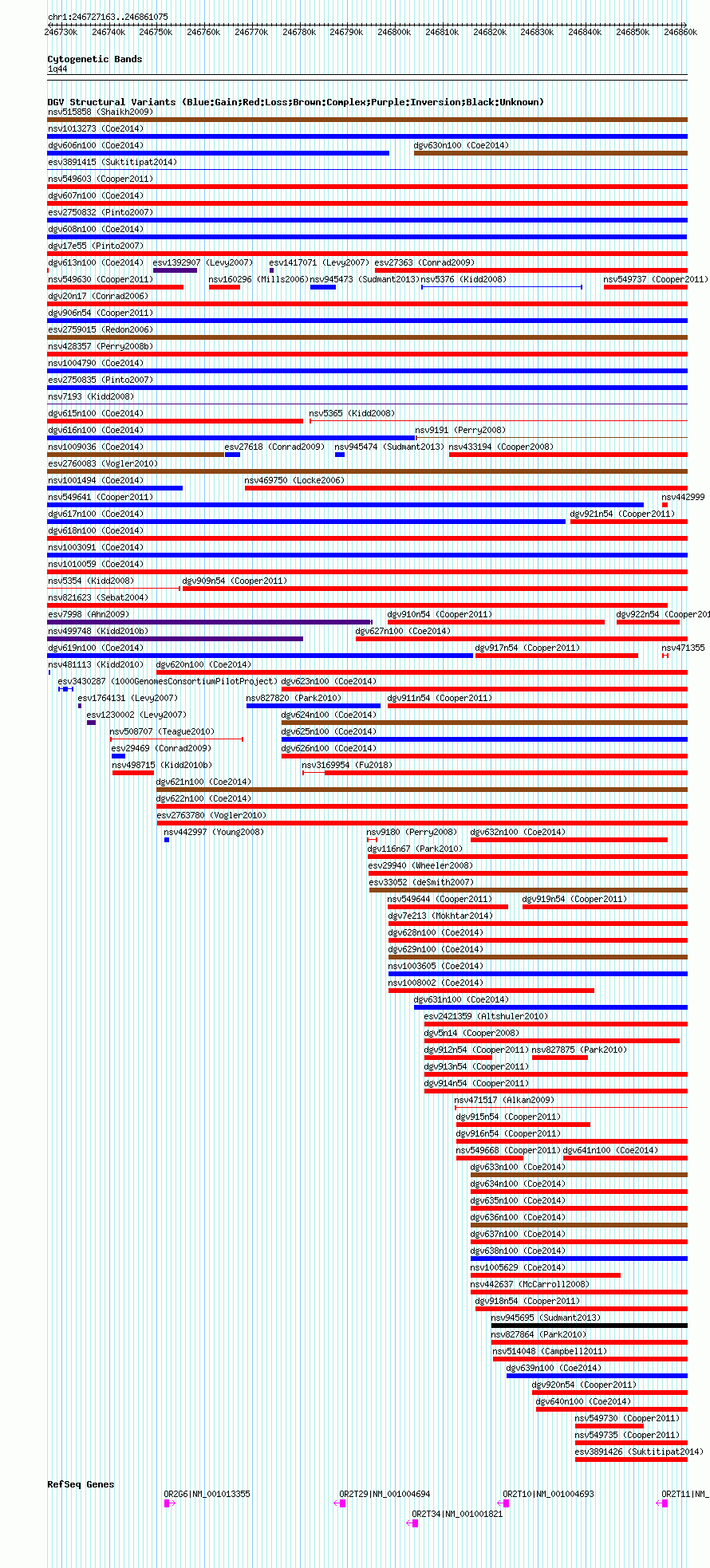 | | Variant Type | CNV loss | | Copy Number | | | Allele State | | | Allele Origin | | | Probe Count | | | Validation Flag | | | Merged Status | M | | Merged Variants | dgv618n100 | | Supporting Variants | nssv3496159 | | Samples | | | Known Genes | OR2G6, OR2T10, OR2T11, OR2T29, OR2T34 | | Method | SNP array | | Analysis | Affymetrix SNP array copy number analysis | | Platform | Affymetrix SNP Array 6.0 | | Comments | | | Reference | Coe_et_al_2014 | | Pubmed ID | 25217958 | | Accession Number(s) | nsv1013970