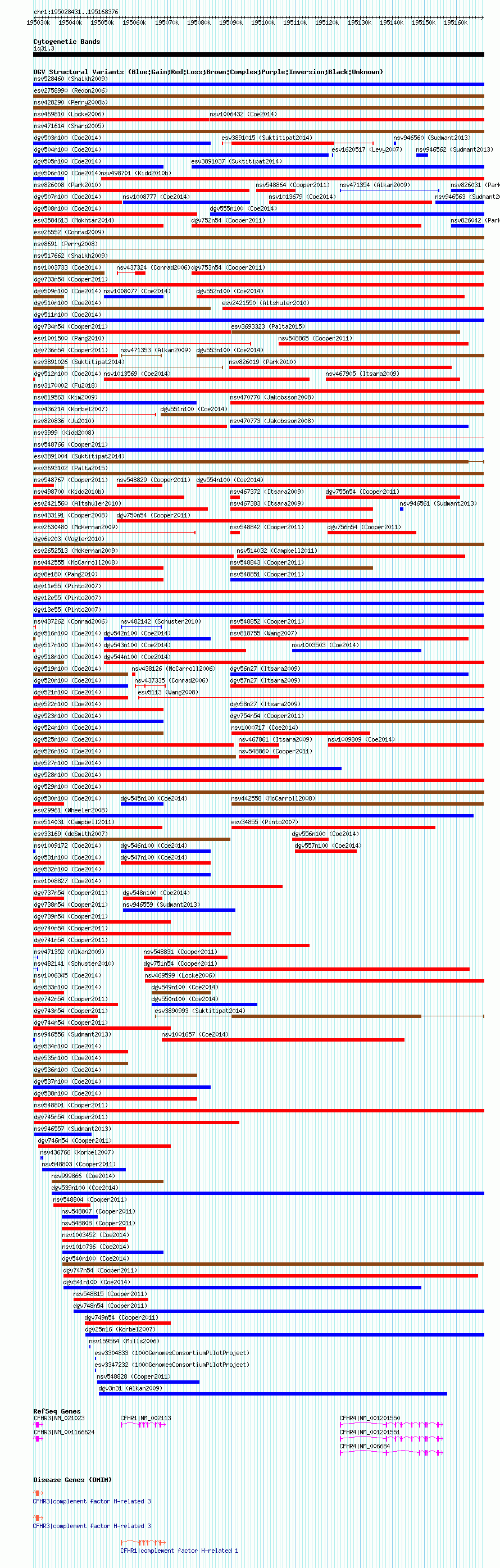 | | Variant Type | CNV loss | | Copy Number | | | Allele State | | | Allele Origin | | | Probe Count | | | Validation Flag | | | Merged Status | M | | Merged Variants | dgv528n100 | | Supporting Variants | nssv3494719, nssv3496496 | | Samples | | | Known Genes | CFHR1, CFHR3, CFHR4 | | Method | SNP array | | Analysis | Affymetrix SNP array copy number analysis | | Platform | Affymetrix SNP Array 6.0 | | Comments | | | Reference | Coe_et_al_2014 | | Pubmed ID | 25217958 | | Accession Number(s) | nsv1014247