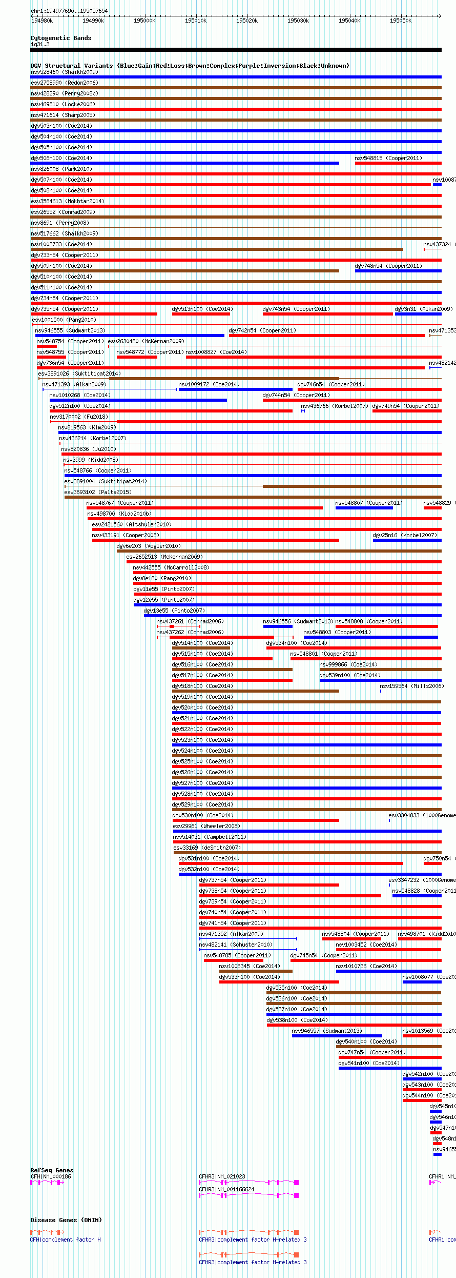 | | Variant Type | CNV gain | | Copy Number | | | Allele State | | | Allele Origin | | | Probe Count | | | Validation Flag | | | Merged Status | M | | Merged Variants | dgv505n100 | | Supporting Variants | nssv3497653 | | Samples | | | Known Genes | CFH, CFHR1, CFHR3 | | Method | SNP array | | Analysis | Affymetrix SNP array copy number analysis | | Platform | Affymetrix SNP Array 6.0 | | Comments | | | Reference | Coe_et_al_2014 | | Pubmed ID | 25217958 | | Accession Number(s) | nsv1014427