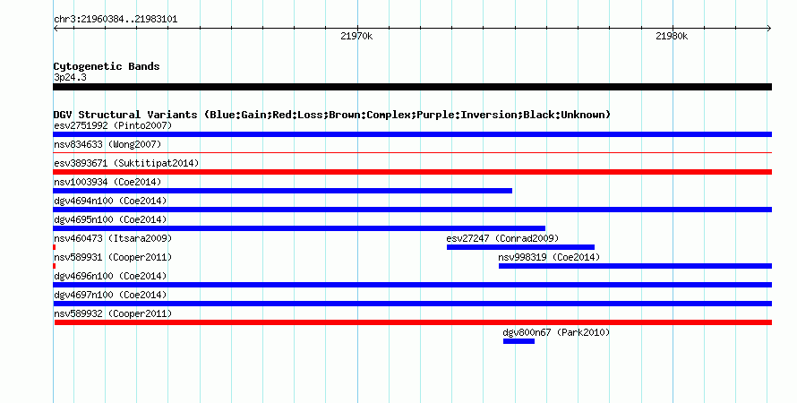 Variant DetailsVariant: nsv1014467| Internal ID | 19103685 | | Landmark | | | Location Information | | | Cytoband | 3p24.3 | | Allele length | | Assembly | Allele length | | hg38 | 22718 | | hg19 | 22718 | | hg18 | 22718 |