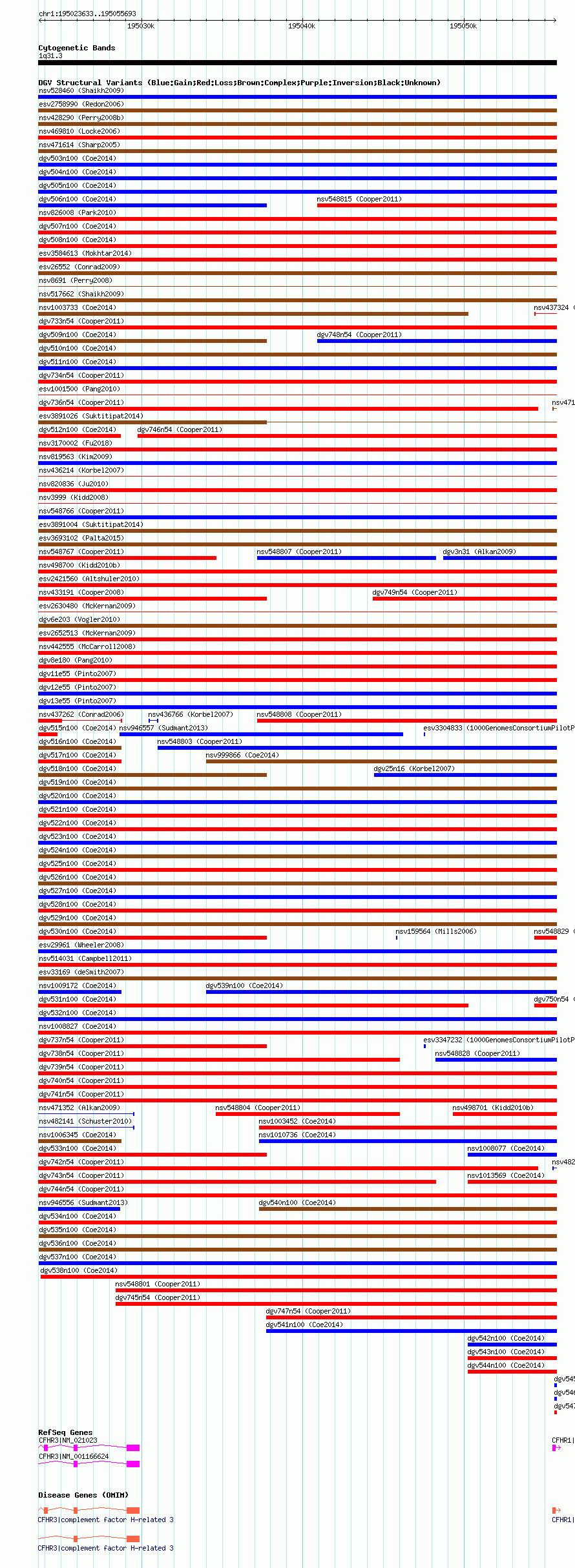 | | Variant Type | CNV gain+loss | | Copy Number | | | Allele State | | | Allele Origin | | | Probe Count | | | Validation Flag | | | Merged Status | M | | Merged Variants | dgv535n100 | | Supporting Variants | nssv3501223, nssv3484369, nssv3488628, nssv3483513, nssv3487883 | | Samples | | | Known Genes | CFHR1, CFHR3 | | Method | SNP array | | Analysis | Affymetrix SNP array copy number analysis | | Platform | Affymetrix SNP Array 6.0 | | Comments | | | Reference | Coe_et_al_2014 | | Pubmed ID | 25217958 | | Accession Number(s) | nsv1014474