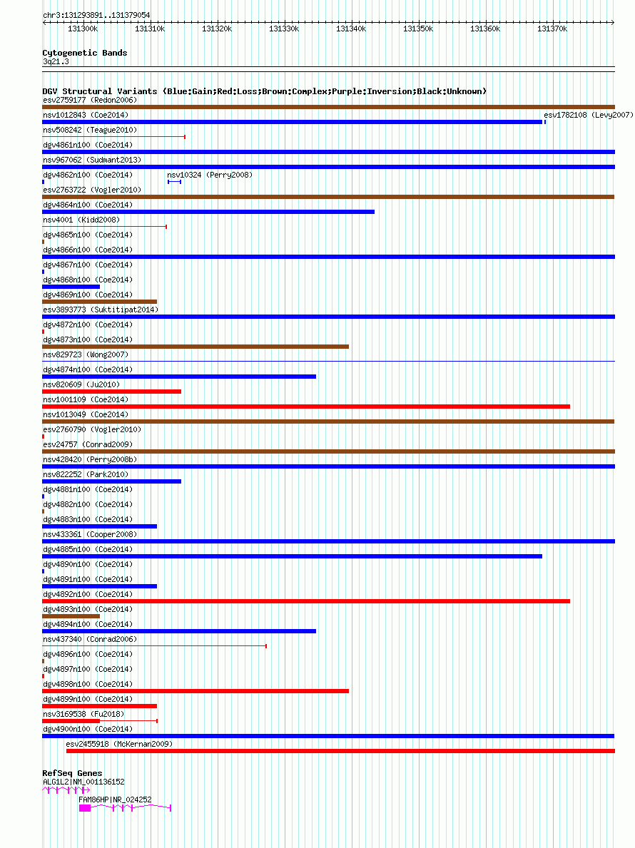 | | Variant Type | CNV gain | | Copy Number | | | Allele State | | | Allele Origin | | | Probe Count | | | Validation Flag | | | Merged Status | M | | Merged Variants | dgv4900n100 | | Supporting Variants | nssv3607130 | | Samples | | | Known Genes | ALG1L2, FAM86HP | | Method | SNP array | | Analysis | Affymetrix SNP array copy number analysis | | Platform | Affymetrix SNP Array 6.0 | | Comments | | | Reference | Coe_et_al_2014 | | Pubmed ID | 25217958 | | Accession Number(s) | nsv1014486