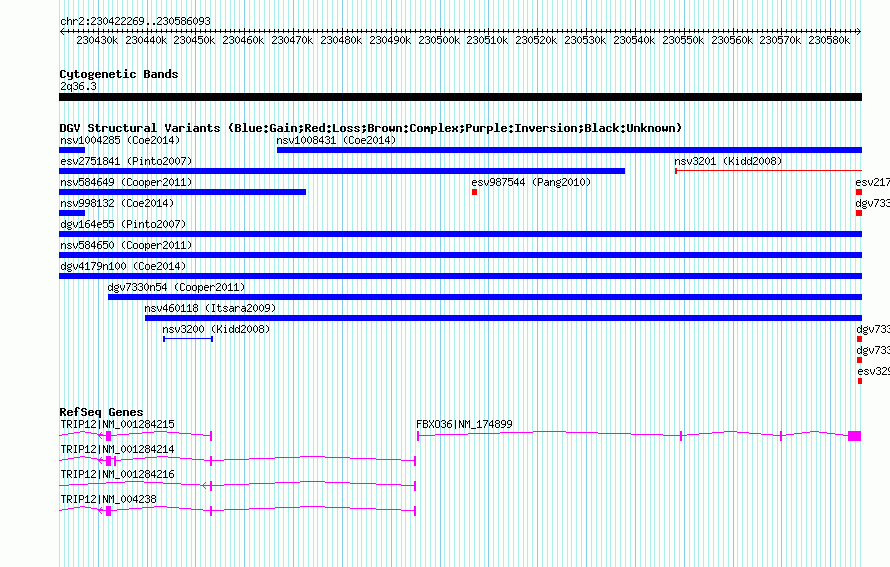 | | Variant Type | CNV gain | | Copy Number | | | Allele State | | | Allele Origin | | | Probe Count | | | Validation Flag | | | Merged Status | M | | Merged Variants | dgv4179n100 | | Supporting Variants | nssv3586854 | | Samples | | | Known Genes | FBXO36, TRIP12 | | Method | SNP array | | Analysis | Affymetrix SNP array copy number analysis | | Platform | Affymetrix SNP Array 6.0 | | Comments | | | Reference | Coe_et_al_2014 | | Pubmed ID | 25217958 | | Accession Number(s) | nsv1014621