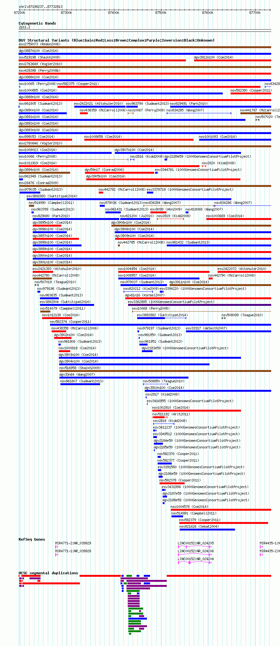 Variant DetailsVariant: nsv1014745| Internal ID | 18757280 | | Landmark | | | Location Information | | | Cytoband | 2p11.2 | | Allele length | | Assembly | Allele length | | hg38 | 534577 | | hg19 | 606973 | | hg18 | 534577 |