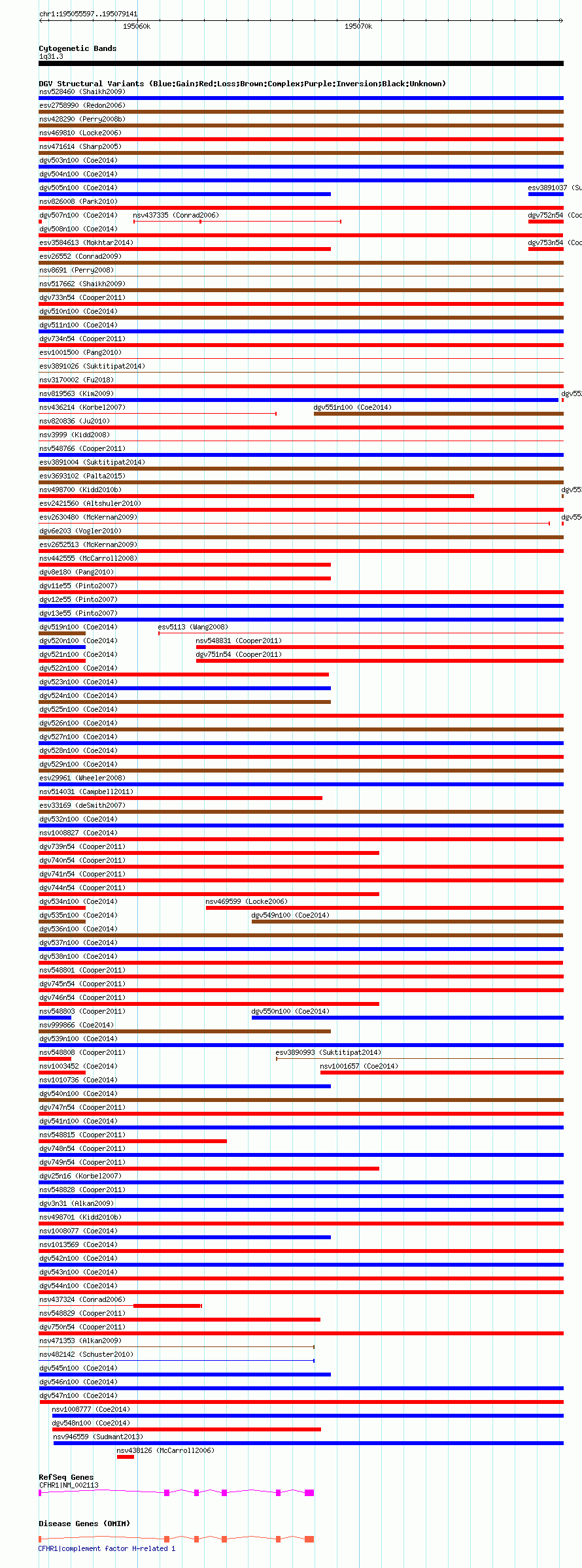Variant DetailsVariant: nsv1014810| Internal ID | 19104027 | | Landmark | | | Location Information | | | Cytoband | 1q31.3 | | Allele length | | Assembly | Allele length | | hg38 | 23545 | | hg19 | 23545 | | hg18 | 23545 |