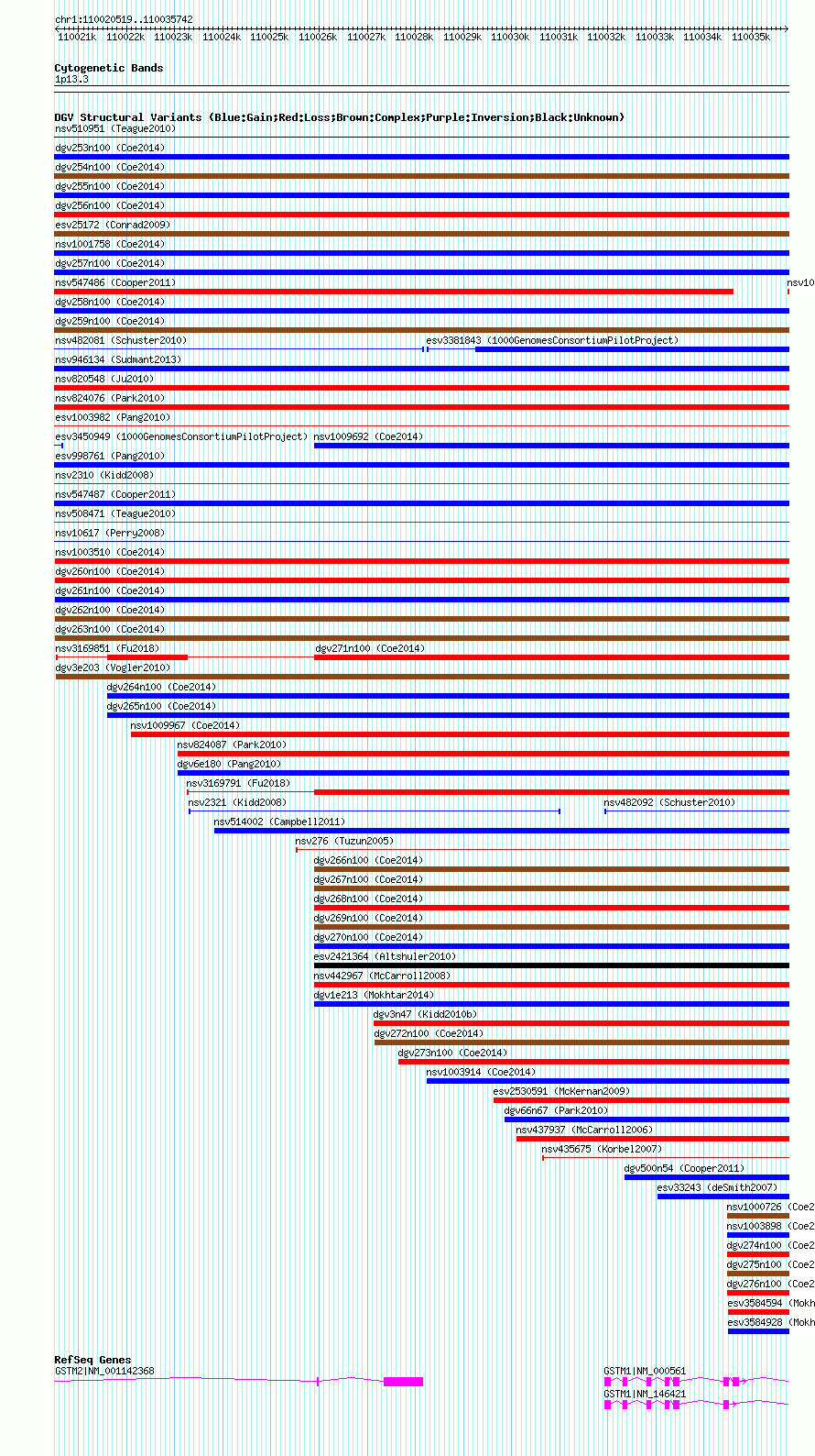 | | Variant Type | CNV gain | | Copy Number | | | Allele State | | | Allele Origin | | | Probe Count | | | Validation Flag | | | Merged Status | M | | Merged Variants | dgv261n100 | | Supporting Variants | nssv3498203 | | Samples | | | Known Genes | GSTM1, GSTM2 | | Method | SNP array | | Analysis | Affymetrix SNP array copy number analysis | | Platform | Affymetrix SNP Array 6.0 | | Comments | | | Reference | Coe_et_al_2014 | | Pubmed ID | 25217958 | | Accession Number(s) | nsv1014897