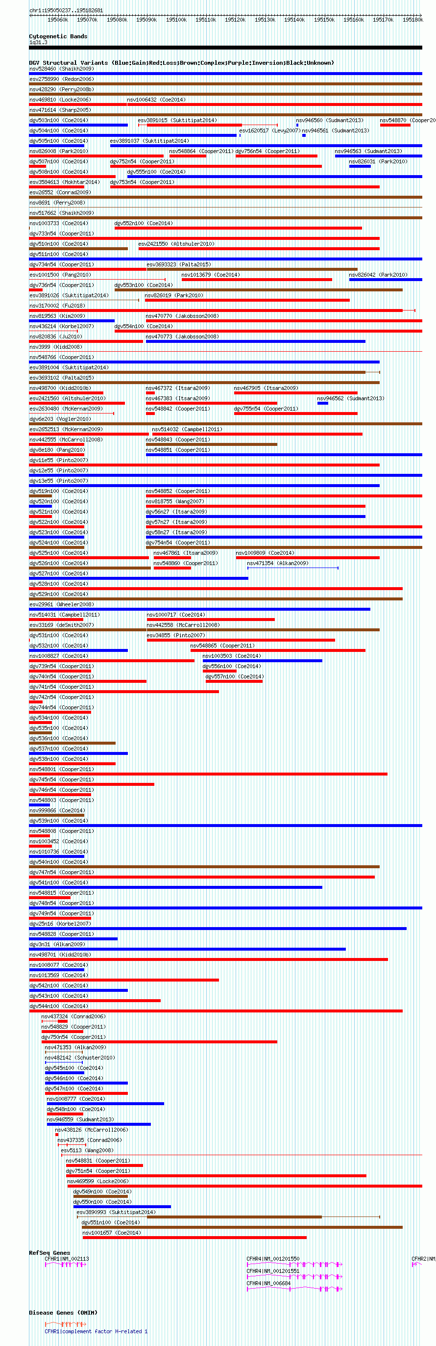 Variant DetailsVariant: nsv1014982| Internal ID | 19104199 | | Landmark | | | Location Information | | | Cytoband | 1q31.3 | | Allele length | | Assembly | Allele length | | hg38 | 132445 | | hg19 | 132445 | | hg18 | 132445 |