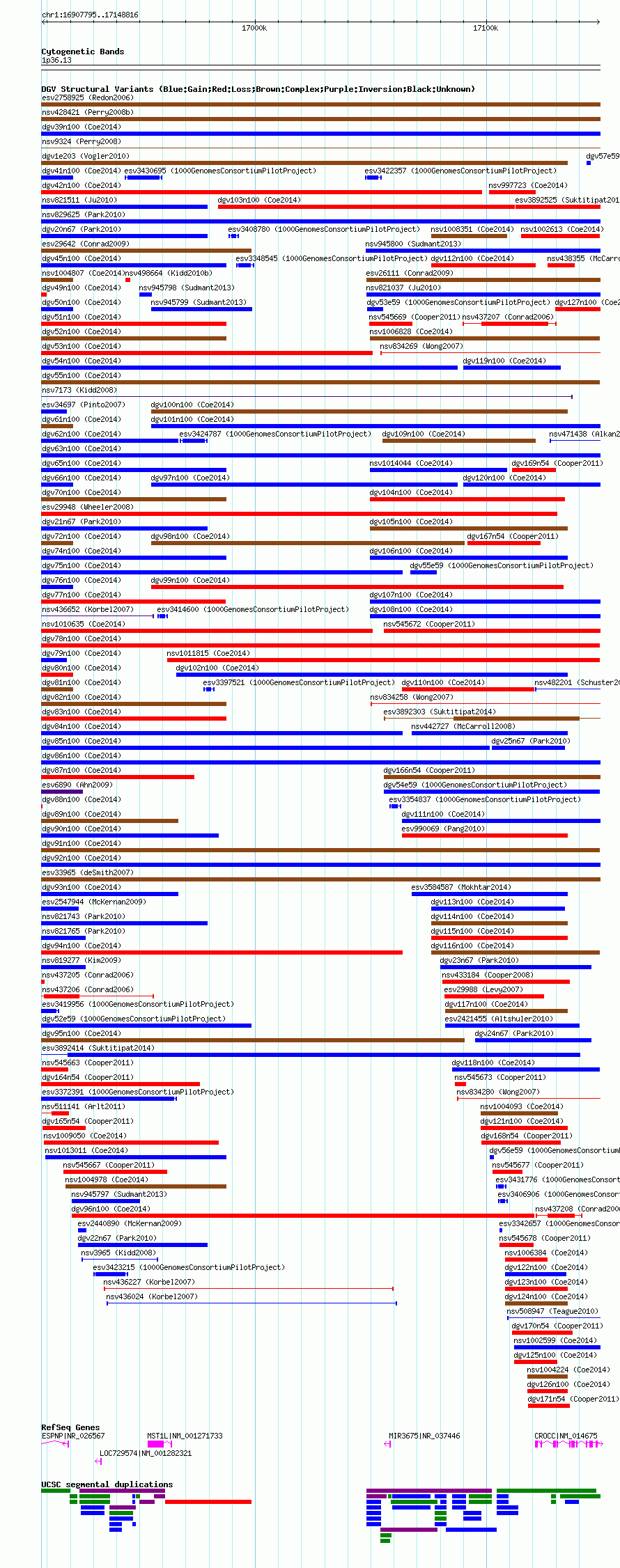Variant DetailsVariant: nsv1015101| Internal ID | 18757636 | | Landmark | | | Location Information | | | Cytoband | 1p36.13 | | Allele length | | Assembly | Allele length | | hg38 | 241022 | | hg19 | 241022 | | hg18 | 241022 |