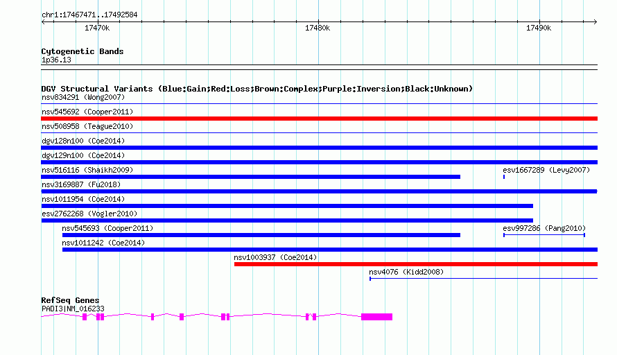 Variant DetailsVariant: nsv1015132| Internal ID | 19104349 | | Landmark | | | Location Information | | | Cytoband | 1p36.13 | | Allele length | | Assembly | Allele length | | hg38 | 25114 | | hg19 | 25114 | | hg18 | 25114 |