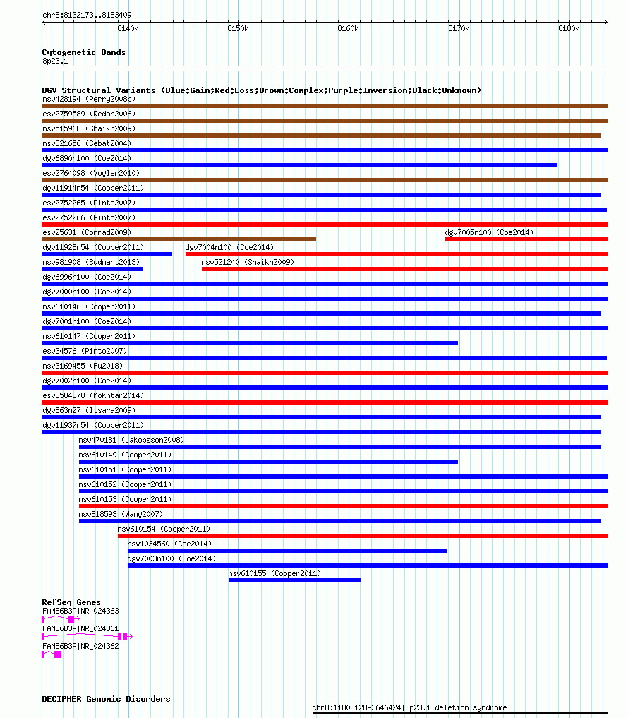 Variant DetailsVariant: nsv1015765| Internal ID | 19104983 | | Landmark | | | Location Information | | | Cytoband | 8p23.1 | | Allele length | | Assembly | Allele length | | hg38 | 51237 | | hg19 | 51237 | | hg18 | 51237 |