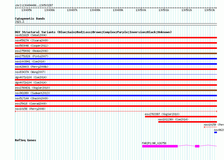 Variant DetailsVariant: nsv10158| Internal ID | 15845121 | | Landmark | | | Location Information | | | Cytoband | 2q21.1 | | Allele length | | Assembly | Allele length | | hg38 | 8802 | | hg19 | 8802 | | hg18 | 8802 | | hg17 | 8802 |