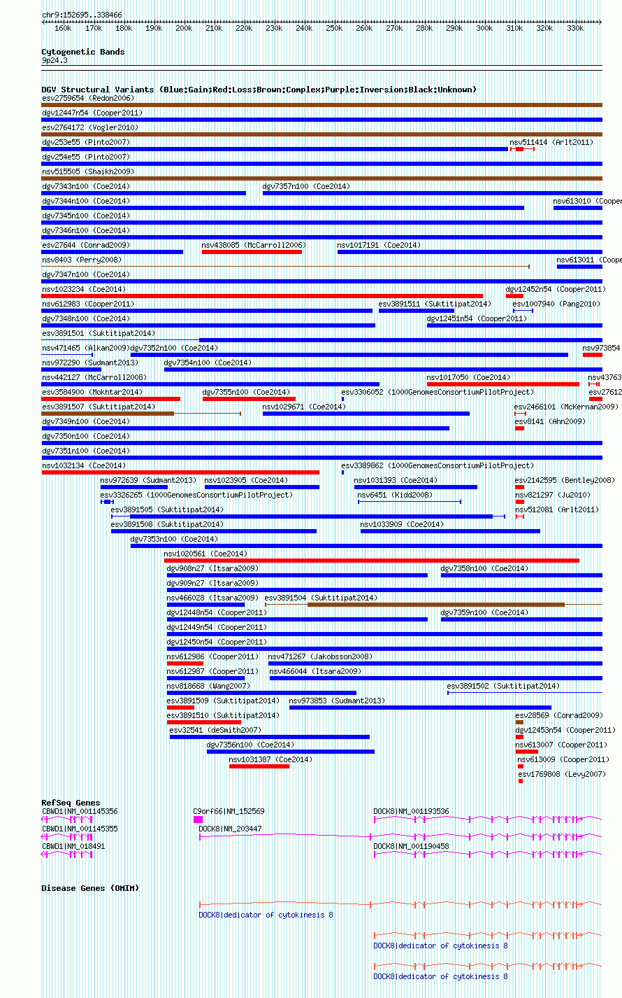 | | Variant Type | CNV gain | | Copy Number | | | Allele State | | | Allele Origin | | | Probe Count | | | Validation Flag | | | Merged Status | M | | Merged Variants | dgv7350n100 | | Supporting Variants | nssv3690975 | | Samples | | | Known Genes | C9orf66, CBWD1, DOCK8 | | Method | SNP array | | Analysis | Affymetrix SNP array copy number analysis | | Platform | Affymetrix SNP Array 6.0 | | Comments | | | Reference | Coe_et_al_2014 | | Pubmed ID | 25217958 | | Accession Number(s) | nsv1015936