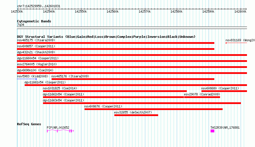 | | Variant Type | CNV loss | | Copy Number | | | Allele State | | | Allele Origin | | | Probe Count | | | Validation Flag | | | Merged Status | M | | Merged Variants | dgv6698n100 | | Supporting Variants | nssv3669496, nssv3669495, nssv3669497, nssv3669494 | | Samples | | | Known Genes | PIP, TAS2R39 | | Method | SNP array | | Analysis | Affymetrix SNP array copy number analysis | | Platform | Affymetrix SNP Array 6.0 | | Comments | | | Reference | Coe_et_al_2014 | | Pubmed ID | 25217958 | | Accession Number(s) | nsv1016130