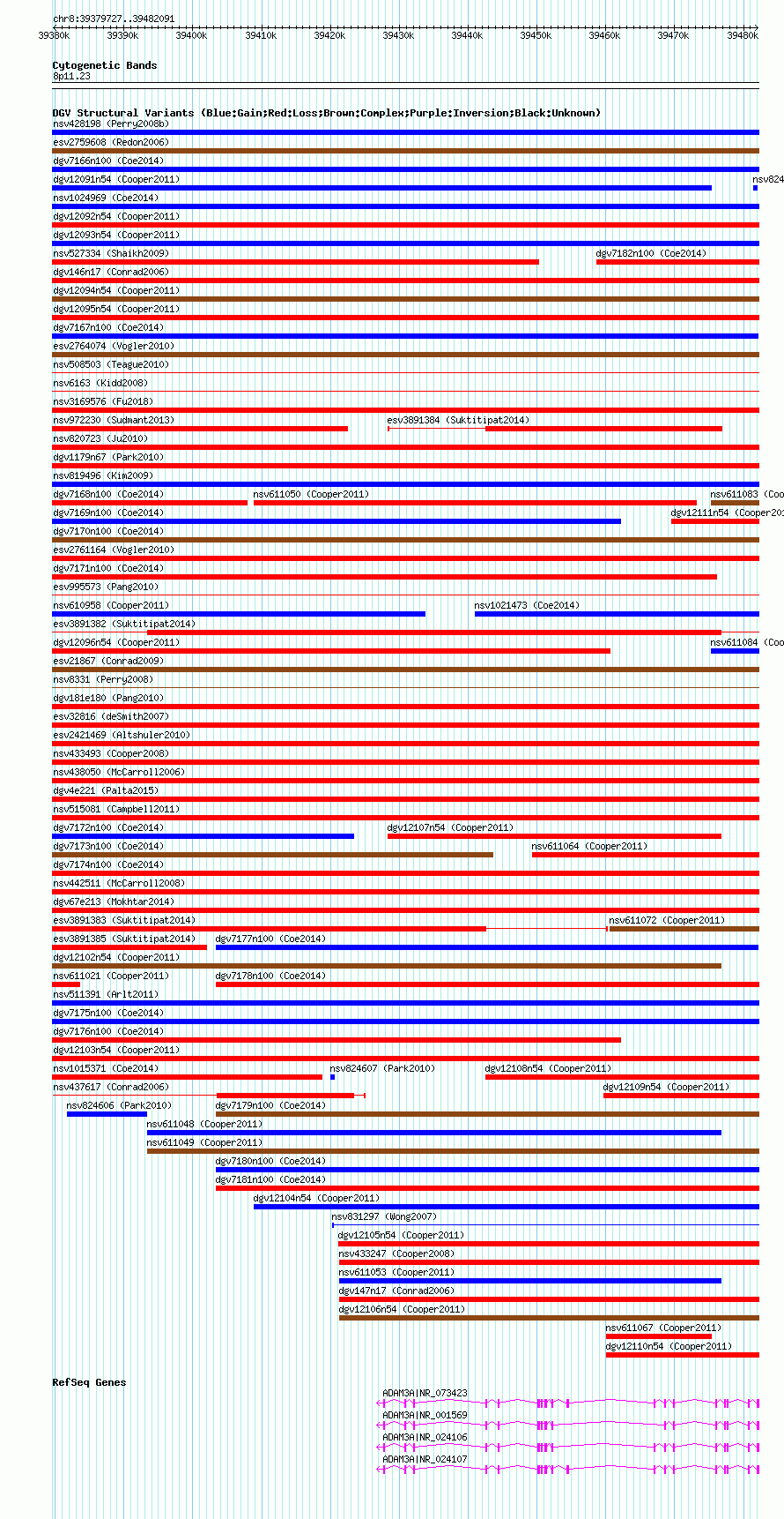 Variant DetailsVariant: nsv1016546| Internal ID | 19105765 | | Landmark | | | Location Information | | | Cytoband | 8p11.22 | | Allele length | | Assembly | Allele length | | hg38 | 102365 | | hg19 | 102365 | | hg18 | 102365 |