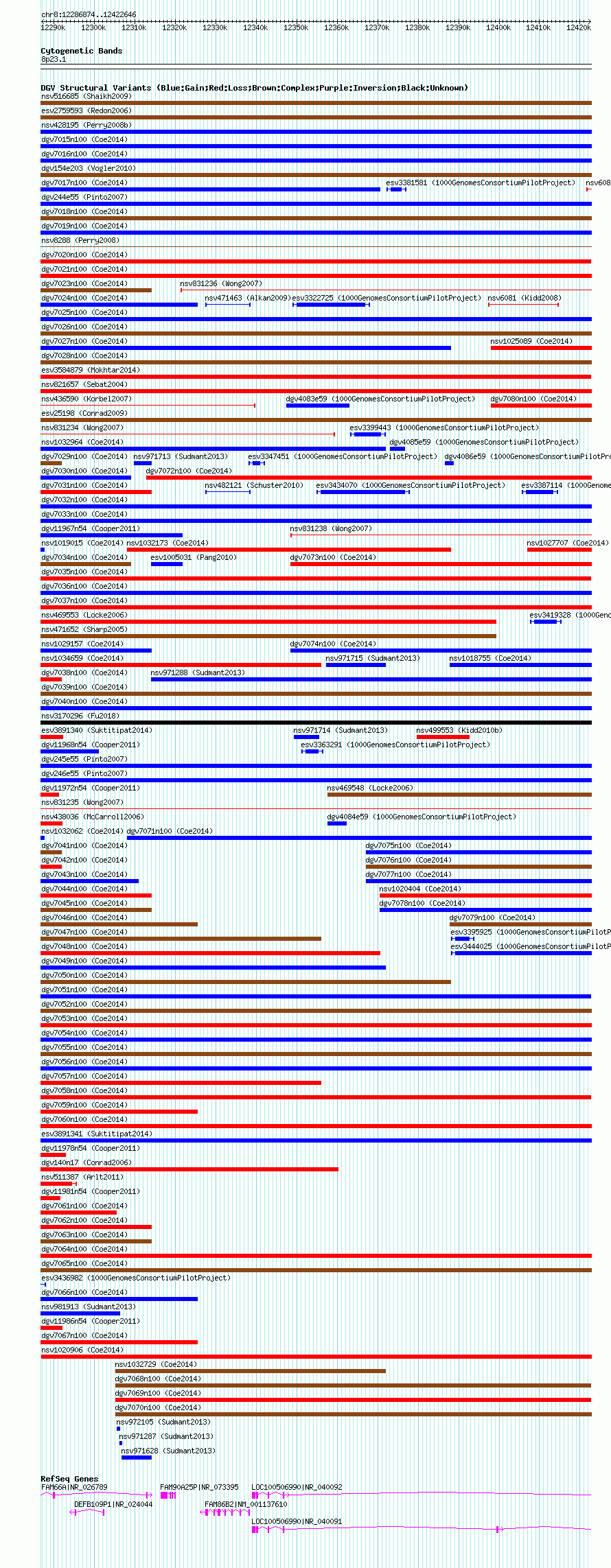 Variant DetailsVariant: nsv1016673| Internal ID | 19105890 | | Landmark | | | Location Information | | | Cytoband | 8p23.1 | | Allele length | | Assembly | Allele length | | hg38 | 135773 | | hg19 | 135773 | | hg18 | 135773 |