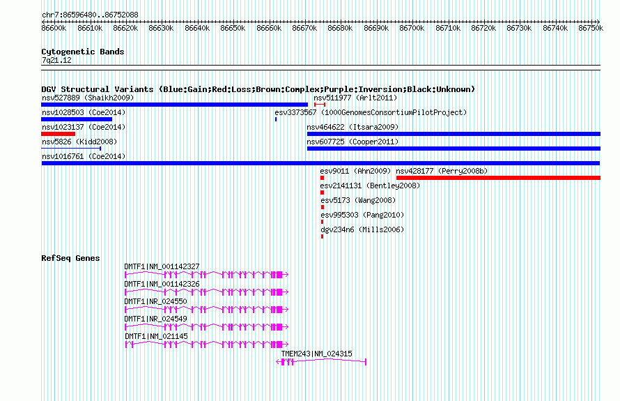 | | Variant Type | CNV gain | | Copy Number | | | Allele State | | | Allele Origin | | | Probe Count | | | Validation Flag | | | Merged Status | M | | Merged Variants | | | Supporting Variants | nssv3655187 | | Samples | | | Known Genes | DMTF1, TMEM243 | | Method | SNP array | | Analysis | Affymetrix SNP array copy number analysis | | Platform | Affymetrix SNP Array 6.0 | | Comments | | | Reference | Coe_et_al_2014 | | Pubmed ID | 25217958 | | Accession Number(s) | nsv1016761