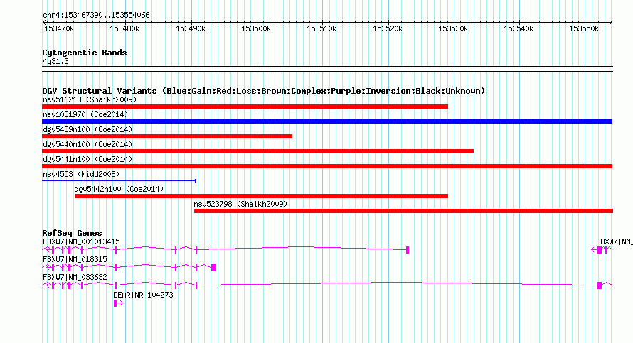| | Variant Type | CNV loss | | Copy Number | | | Allele State | | | Allele Origin | | | Probe Count | | | Validation Flag | | | Merged Status | M | | Merged Variants | dgv5441n100 | | Supporting Variants | nssv3636121 | | Samples | | | Known Genes | DEAR, FBXW7 | | Method | SNP array | | Analysis | Affymetrix SNP array copy number analysis | | Platform | Affymetrix SNP Array 6.0 | | Comments | | | Reference | Coe_et_al_2014 | | Pubmed ID | 25217958 | | Accession Number(s) | nsv1017089