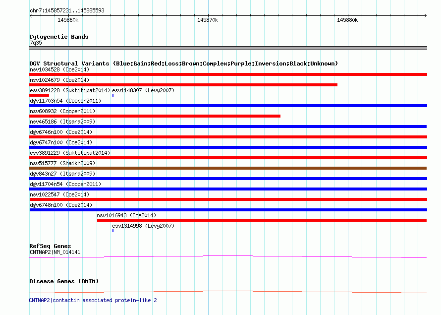 | | Variant Type | CNV gain | | Copy Number | | | Allele State | | | Allele Origin | | | Probe Count | | | Validation Flag | | | Merged Status | M | | Merged Variants | dgv6747n100 | | Supporting Variants | nssv3757716, nssv3674200, nssv3674198, nssv3674203, nssv3674206, nssv3674199, nssv3674207, nssv3674202, nssv3674204, nssv3674205, nssv3674201 | | Samples | | | Known Genes | CNTNAP2 | | Method | SNP array | | Analysis | Affymetrix SNP array copy number analysis | | Platform | Affymetrix SNP Array 6.0 | | Comments | | | Reference | Coe_et_al_2014 | | Pubmed ID | 25217958 | | Accession Number(s) | nsv1017143
