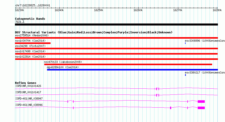 | | Variant Type | CNV loss | | Copy Number | | | Allele State | | | Allele Origin | | | Probe Count | | | Validation Flag | | | Merged Status | M | | Merged Variants | | | Supporting Variants | nssv3643193 | | Samples | | | Known Genes | ISPD, ISPD-AS1 | | Method | SNP array | | Analysis | Affymetrix SNP array copy number analysis | | Platform | Affymetrix SNP Array 6.0 | | Comments | | | Reference | Coe_et_al_2014 | | Pubmed ID | 25217958 | | Accession Number(s) | nsv1017498