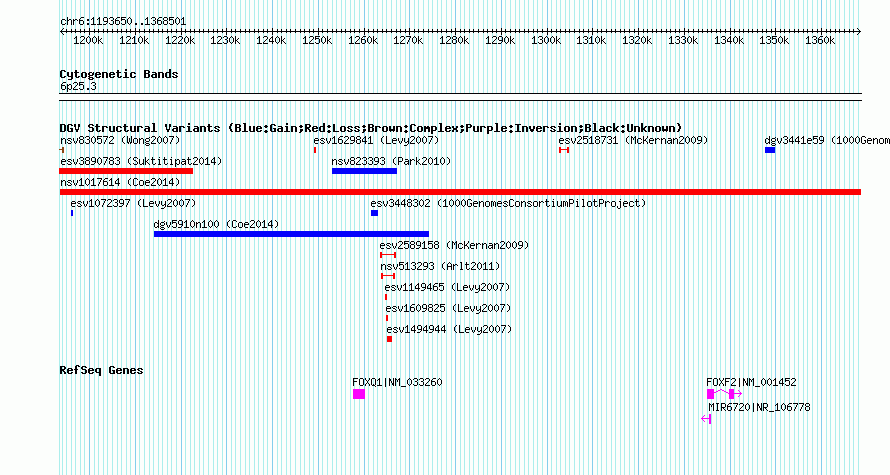 | | Variant Type | CNV loss | | Copy Number | | | Allele State | | | Allele Origin | | | Probe Count | | | Validation Flag | | | Merged Status | M | | Merged Variants | | | Supporting Variants | nssv3654715 | | Samples | | | Known Genes | FOXF2, FOXQ1, MIR6720 | | Method | SNP array | | Analysis | Affymetrix SNP array copy number analysis | | Platform | Affymetrix SNP Array 6.0 | | Comments | | | Reference | Coe_et_al_2014 | | Pubmed ID | 25217958 | | Accession Number(s) | nsv1017614