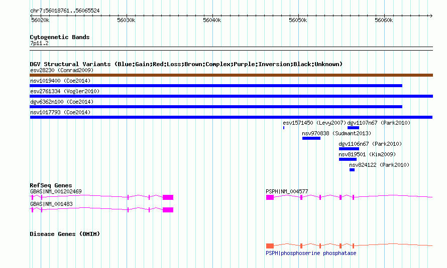 | | Variant Type | CNV gain | | Copy Number | | | Allele State | | | Allele Origin | | | Probe Count | | | Validation Flag | | | Merged Status | M | | Merged Variants | | | Supporting Variants | nssv3661424 | | Samples | | | Known Genes | GBAS, PSPH | | Method | SNP array | | Analysis | Affymetrix SNP array copy number analysis | | Platform | Affymetrix SNP Array 6.0 | | Comments | | | Reference | Coe_et_al_2014 | | Pubmed ID | 25217958 | | Accession Number(s) | nsv1017793