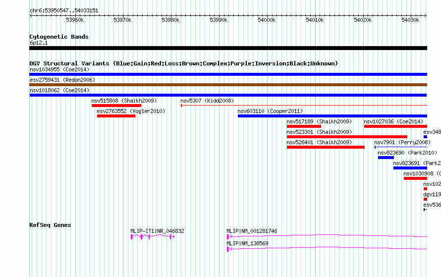 | | Variant Type | CNV gain | | Copy Number | | | Allele State | | | Allele Origin | | | Probe Count | | | Validation Flag | | | Merged Status | M | | Merged Variants | | | Supporting Variants | nssv3657478 | | Samples | | | Known Genes | MLIP, MLIP-IT1 | | Method | SNP array | | Analysis | Affymetrix SNP array copy number analysis | | Platform | Affymetrix SNP Array 6.0 | | Comments | | | Reference | Coe_et_al_2014 | | Pubmed ID | 25217958 | | Accession Number(s) | nsv1018062