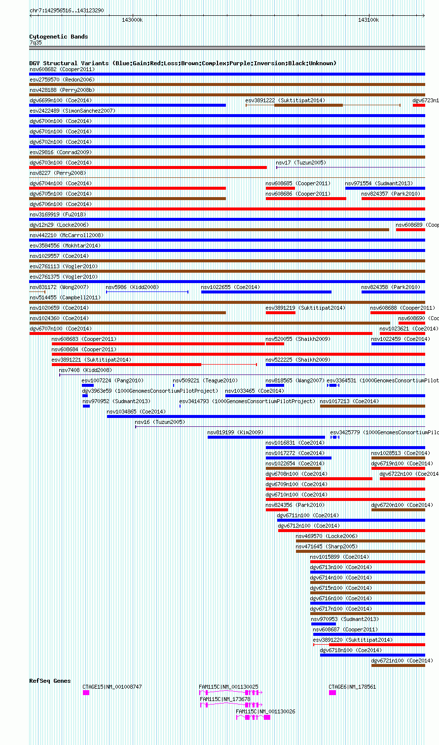 | | Variant Type | CNV gain | | Copy Number | | | Allele State | | | Allele Origin | | | Probe Count | | | Validation Flag | | | Merged Status | M | | Merged Variants | dgv6701n100 | | Supporting Variants | nssv3670385 | | Samples | | | Known Genes | CTAGE15, CTAGE6, FAM115C | | Method | SNP array | | Analysis | Affymetrix SNP array copy number analysis | | Platform | Affymetrix SNP Array 6.0 | | Comments | | | Reference | Coe_et_al_2014 | | Pubmed ID | 25217958 | | Accession Number(s) | nsv1018097