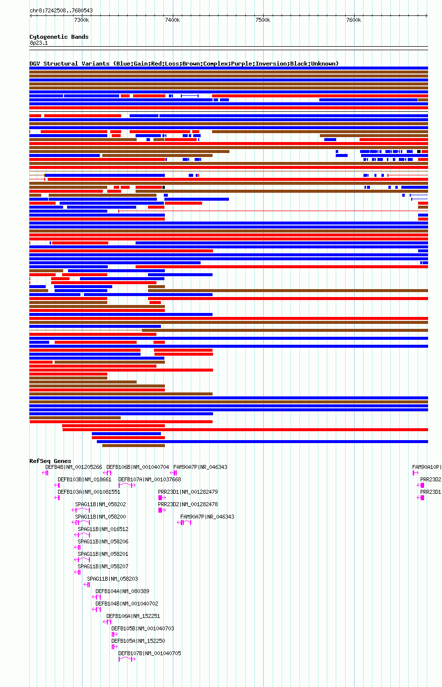| | Variant Type | CNV gain | | Copy Number | | | Allele State | | | Allele Origin | | | Probe Count | | | Validation Flag | | | Merged Status | M | | Merged Variants | dgv6908n100 | | Supporting Variants | nssv3679694 | | Samples | | | Known Genes | DEFB103A, DEFB103B, DEFB104A, DEFB104B, DEFB105A, DEFB105B, DEFB106A, DEFB106B, DEFB107A, DEFB107B, DEFB4B, FAM90A10P, FAM90A7P, PRR23D1, PRR23D2, SPAG11B | | Method | SNP array | | Analysis | Affymetrix SNP array copy number analysis | | Platform | Affymetrix SNP Array 6.0 | | Comments | | | Reference | Coe_et_al_2014 | | Pubmed ID | 25217958 | | Accession Number(s) | nsv1018189
