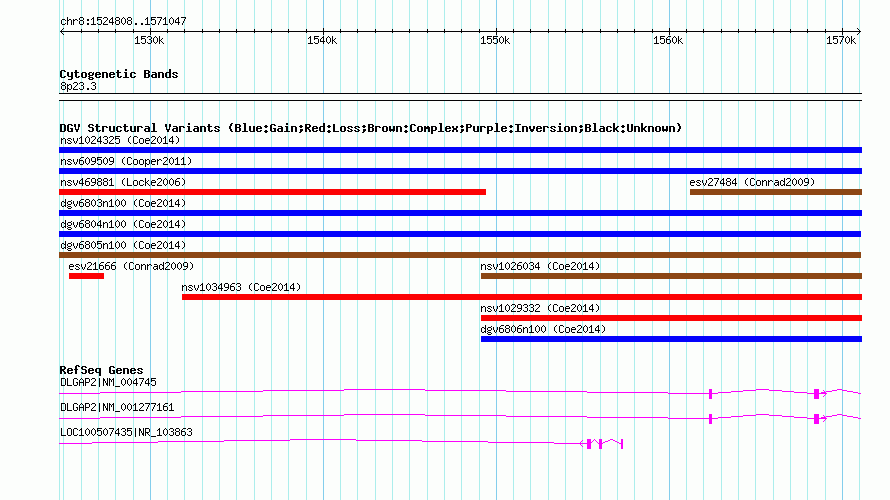 | Variant Type | CNV gain | Copy Number | | Allele State | | Allele Origin | | Probe Count | | Validation Flag | | Merged Status | M | Merged Variants | dgv6804n100 | Supporting Variants | nssv3675054 | Samples | | Known Genes | DLGAP2, LOC100507435 | Method | SNP array | Analysis | Affymetrix SNP array copy number analysis | Platform | Affymetrix SNP Array 6.0 | Comments | | Reference | Coe_et_al_2014 | Pubmed ID | 25217958 | Accession Number(s) | nsv1018273