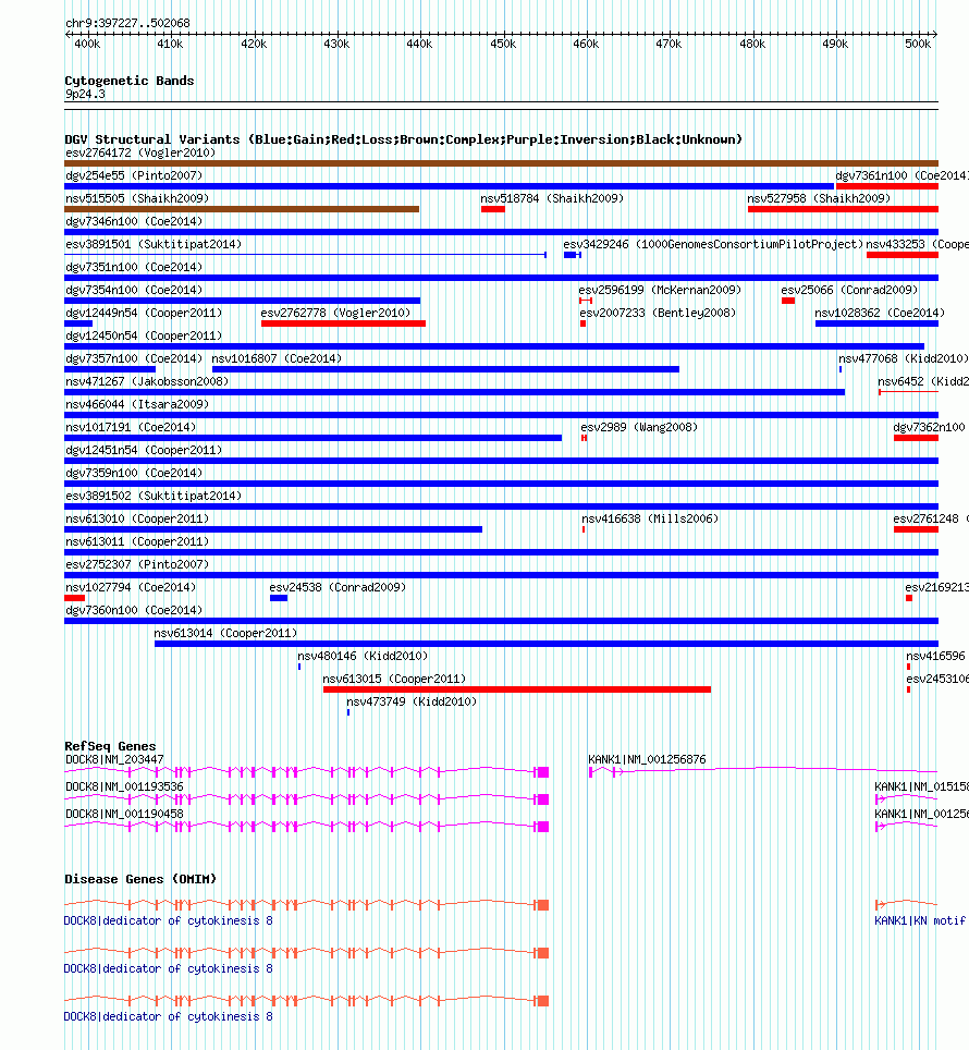 | | Variant Type | CNV gain | | Copy Number | | | Allele State | | | Allele Origin | | | Probe Count | | | Validation Flag | | | Merged Status | M | | Merged Variants | dgv7360n100 | | Supporting Variants | nssv3691020 | | Samples | | | Known Genes | DOCK8, KANK1 | | Method | SNP array | | Analysis | Affymetrix SNP array copy number analysis | | Platform | Affymetrix SNP Array 6.0 | | Comments | | | Reference | Coe_et_al_2014 | | Pubmed ID | 25217958 | | Accession Number(s) | nsv1018307