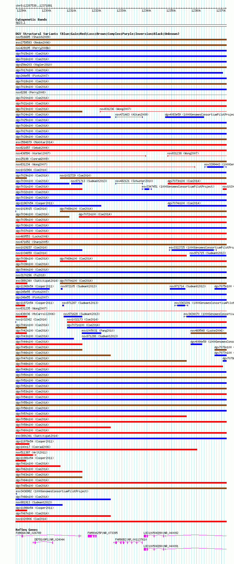 Variant DetailsVariant: nsv1018520| Internal ID | 19107737 | | Landmark | | | Location Information | | | Cytoband | 8p23.1 | | Allele length | | Assembly | Allele length | | hg38 | 84344 | | hg19 | 84344 | | hg18 | 84344 |