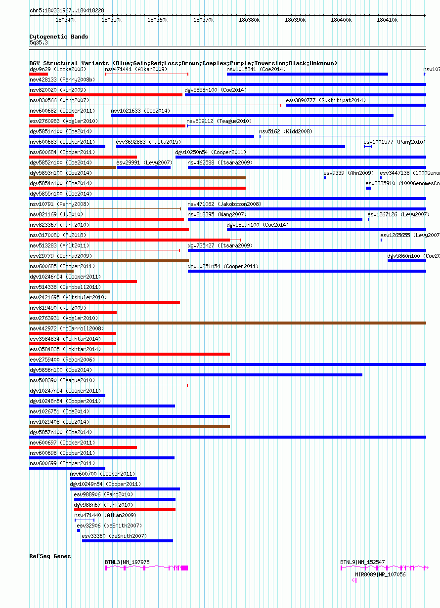 | | Variant Type | CNV gain | | Copy Number | | | Allele State | | | Allele Origin | | | Probe Count | | | Validation Flag | | | Merged Status | M | | Merged Variants | dgv5857n100 | | Supporting Variants | nssv3650330 | | Samples | | | Known Genes | BTNL3, BTNL9, MIR8089 | | Method | SNP array | | Analysis | Affymetrix SNP array copy number analysis | | Platform | Affymetrix SNP Array 6.0 | | Comments | | | Reference | Coe_et_al_2014 | | Pubmed ID | 25217958 | | Accession Number(s) | nsv1018694