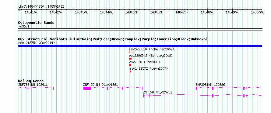 Variant DetailsVariant: nsv1018754| Internal ID | 18761287 | | Landmark | | | Location Information | | | Cytoband | 7q36.1 | | Allele length | | Assembly | Allele length | | hg38 | 96903 | | hg19 | 96903 | | hg18 | 96903 |