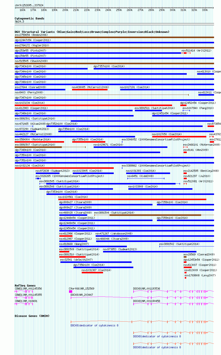 | | Variant Type | CNV gain | | Copy Number | | | Allele State | | | Allele Origin | | | Probe Count | | | Validation Flag | | | Merged Status | M | | Merged Variants | dgv7350n100 | | Supporting Variants | nssv3690974 | | Samples | | | Known Genes | C9orf66, CBWD1, DOCK8 | | Method | SNP array | | Analysis | Affymetrix SNP array copy number analysis | | Platform | Affymetrix SNP Array 6.0 | | Comments | | | Reference | Coe_et_al_2014 | | Pubmed ID | 25217958 | | Accession Number(s) | nsv1018804