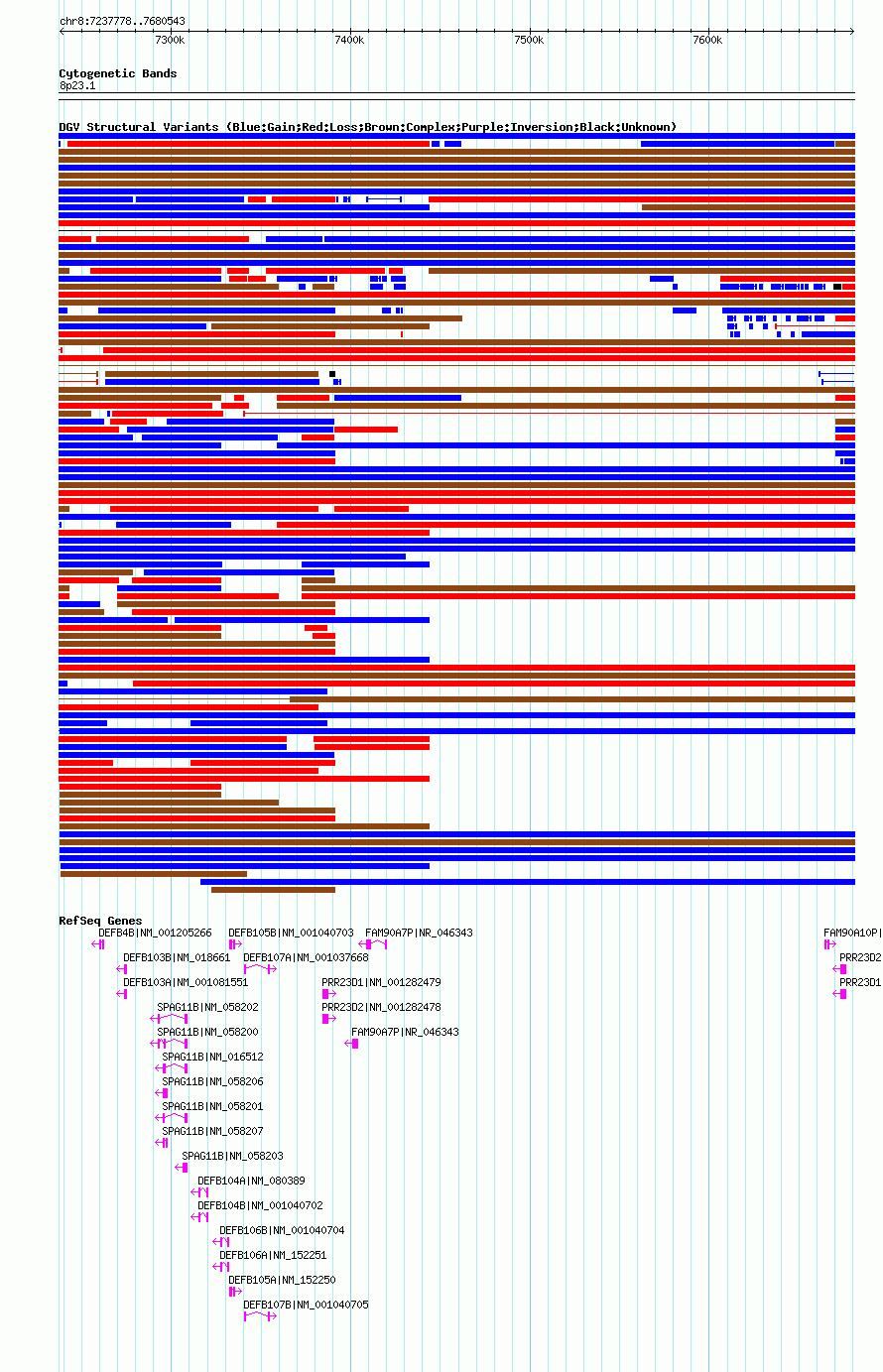 | | Variant Type | CNV gain | | Copy Number | | | Allele State | | | Allele Origin | | | Probe Count | | | Validation Flag | | | Merged Status | M | | Merged Variants | dgv6908n100 | | Supporting Variants | nssv3679026 | | Samples | | | Known Genes | DEFB103A, DEFB103B, DEFB104A, DEFB104B, DEFB105A, DEFB105B, DEFB106A, DEFB106B, DEFB107A, DEFB107B, DEFB4B, FAM90A10P, FAM90A7P, PRR23D1, PRR23D2, SPAG11B | | Method | SNP array | | Analysis | Affymetrix SNP array copy number analysis | | Platform | Affymetrix SNP Array 6.0 | | Comments | | | Reference | Coe_et_al_2014 | | Pubmed ID | 25217958 | | Accession Number(s) | nsv1019128