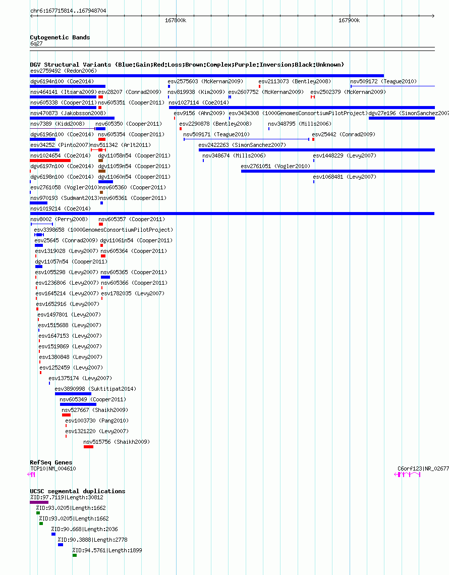 | | Variant Type | CNV gain | | Copy Number | | | Allele State | | | Allele Origin | | | Probe Count | | | Validation Flag | | | Merged Status | M | | Merged Variants | | | Supporting Variants | nssv3655443 | | Samples | | | Known Genes | C6orf123, TCP10 | | Method | SNP array | | Analysis | Affymetrix SNP array copy number analysis | | Platform | Affymetrix SNP Array 6.0 | | Comments | | | Reference | Coe_et_al_2014 | | Pubmed ID | 25217958 | | Accession Number(s) | nsv1019214