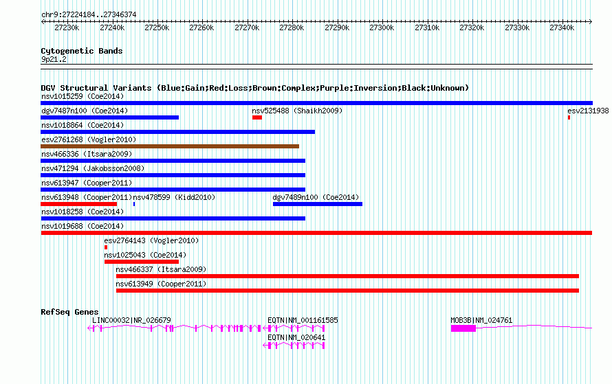 | | Variant Type | CNV loss | | Copy Number | | | Allele State | | | Allele Origin | | | Probe Count | | | Validation Flag | | | Merged Status | M | | Merged Variants | | | Supporting Variants | nssv3692016 | | Samples | | | Known Genes | EQTN, LINC00032, MOB3B | | Method | SNP array | | Analysis | Affymetrix SNP array copy number analysis | | Platform | Affymetrix SNP Array 6.0 | | Comments | | | Reference | Coe_et_al_2014 | | Pubmed ID | 25217958 | | Accession Number(s) | nsv1019688