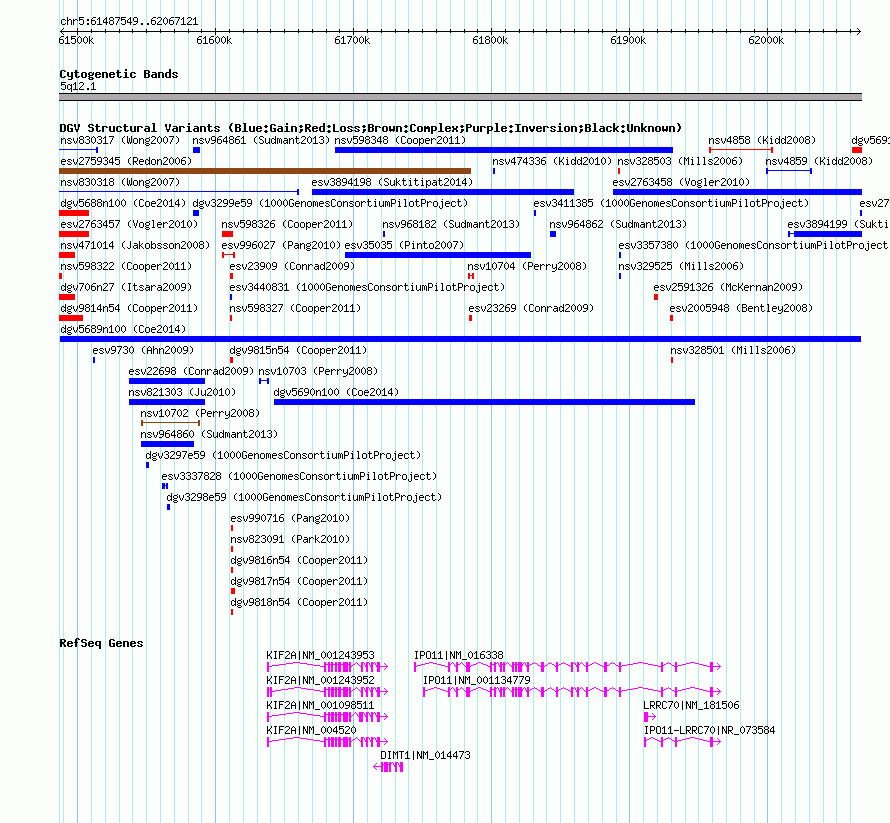 Variant DetailsVariant: nsv1020255| Internal ID | 19109474 | | Landmark | | | Location Information | | | Cytoband | 5q12.1 | | Allele length | | Assembly | Allele length | | hg38 | 579574 | | hg19 | 579574 | | hg18 | 579573 |