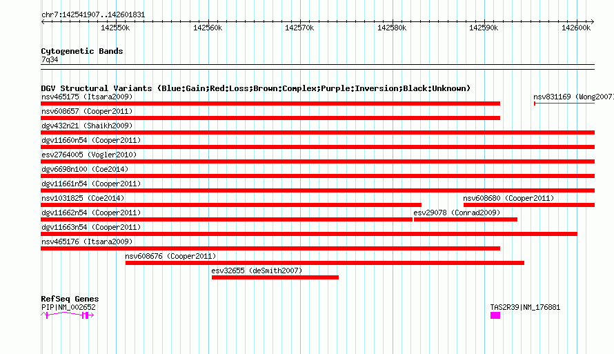 | | Variant Type | CNV loss | | Copy Number | | | Allele State | | | Allele Origin | | | Probe Count | | | Validation Flag | | | Merged Status | M | | Merged Variants | dgv6698n100 | | Supporting Variants | nssv3669649 | | Samples | | | Known Genes | PIP, TAS2R39 | | Method | SNP array | | Analysis | Affymetrix SNP array copy number analysis | | Platform | Affymetrix SNP Array 6.0 | | Comments | | | Reference | Coe_et_al_2014 | | Pubmed ID | 25217958 | | Accession Number(s) | nsv1020588