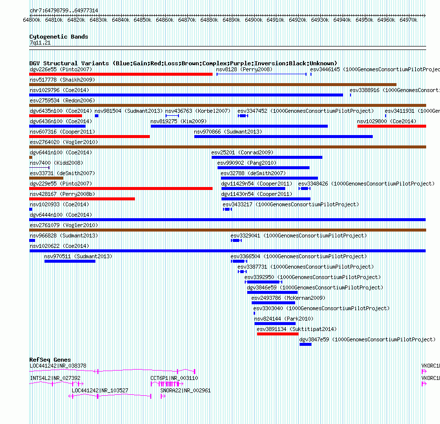 Variant DetailsVariant: nsv1020622| Internal ID | 19109841 | | Landmark | | | Location Information | | | Cytoband | 7q11.21 | | Allele length | | Assembly | Allele length | | hg38 | 178502 | | hg19 | 178516 | | hg18 | 178516 |